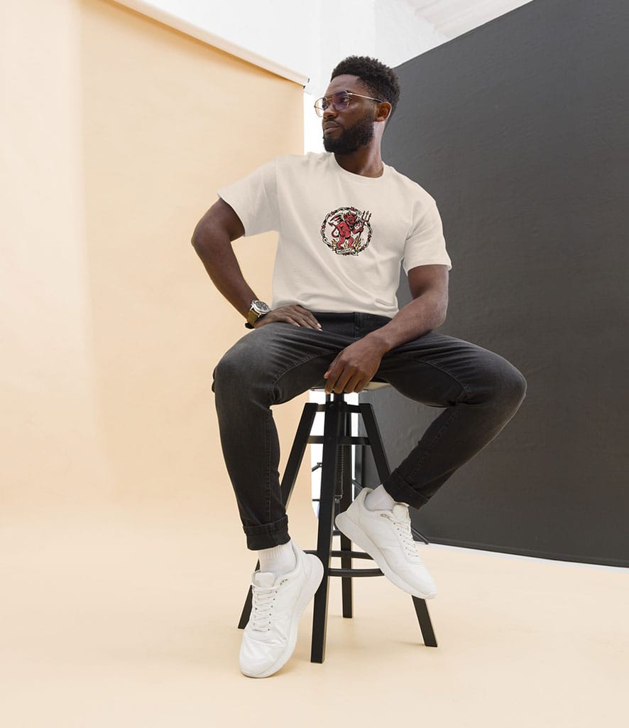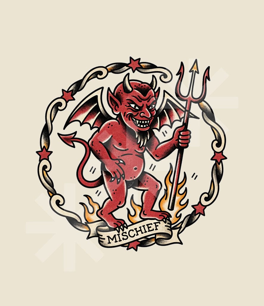 Turn up the heat with this Sailor Jerry tattoo inspired t-shirt, featuring a bold, old-school devil that oozes vintage attitude. Illustrated in classic Americana style, the grinning red devil stands amid flames, trident in hand, framed by traditional tattoo motifs and banner text reading “Mischief.” Thick lines, rich colors, and timeless flash-art details give this design an authentic, hand-inked feel straight out of a mid-century tattoo parlor.