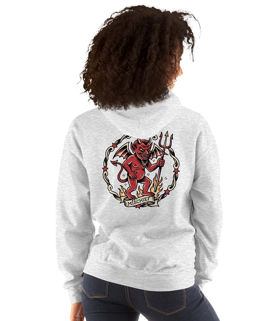 Turn up the heat with this Sailor Jerry tattoo inspired hoodie, featuring a bold, old-school devil that oozes vintage attitude. Illustrated in classic Americana style, the grinning red devil stands amid flames, trident in hand, framed by traditional tattoo motifs and banner text reading “Mischief.” Thick lines, rich colours, and timeless flash-art details give this design an authentic, hand-inked feel straight out of a mid-century tattoo parlour.