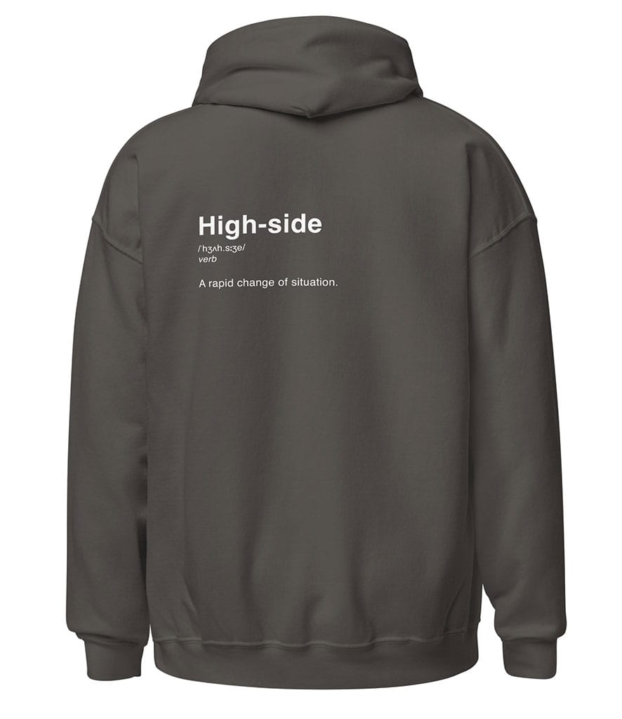 Minimal, dry and painfully accurate, the High-Side Definition Hoodie delivers motorsport humour at its finest. Styled as a clean dictionary entry, this design defines “High-side” simply as “a rapid change of situation” — a phrase that every rider instantly understands, often just a moment too late.