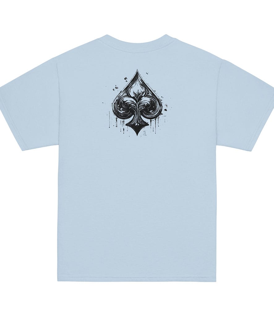The detailed spade design on the back features sharp lines and playful drip-style details, giving it a cool, illustrated look full of personality. With a clean, simple front and an eye-catching back graphic, this tee feels modern, creative and full of confidence.
