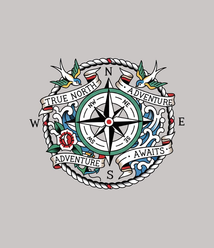 At the centre of the design is a bold compass rose, surrounded by rope details, rolling waves and flying swallows. Vintage-style banners reading “True North” and “Adventure Awaits” add a fun, explorer feel, while clean lines and rich colours give the artwork a timeless, illustrated look.