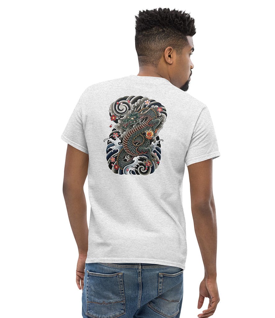 Channel the strength and mystique of classic Eastern artistry with this Traditional Japanese Dragon T-Shirt. Inspired by the iconic Irezumi tattoo style, the design features a fierce dragon twisting through crashing waves and swirling clouds, surrounded by delicate cherry blossoms that symbolise beauty and the fleeting nature of life.